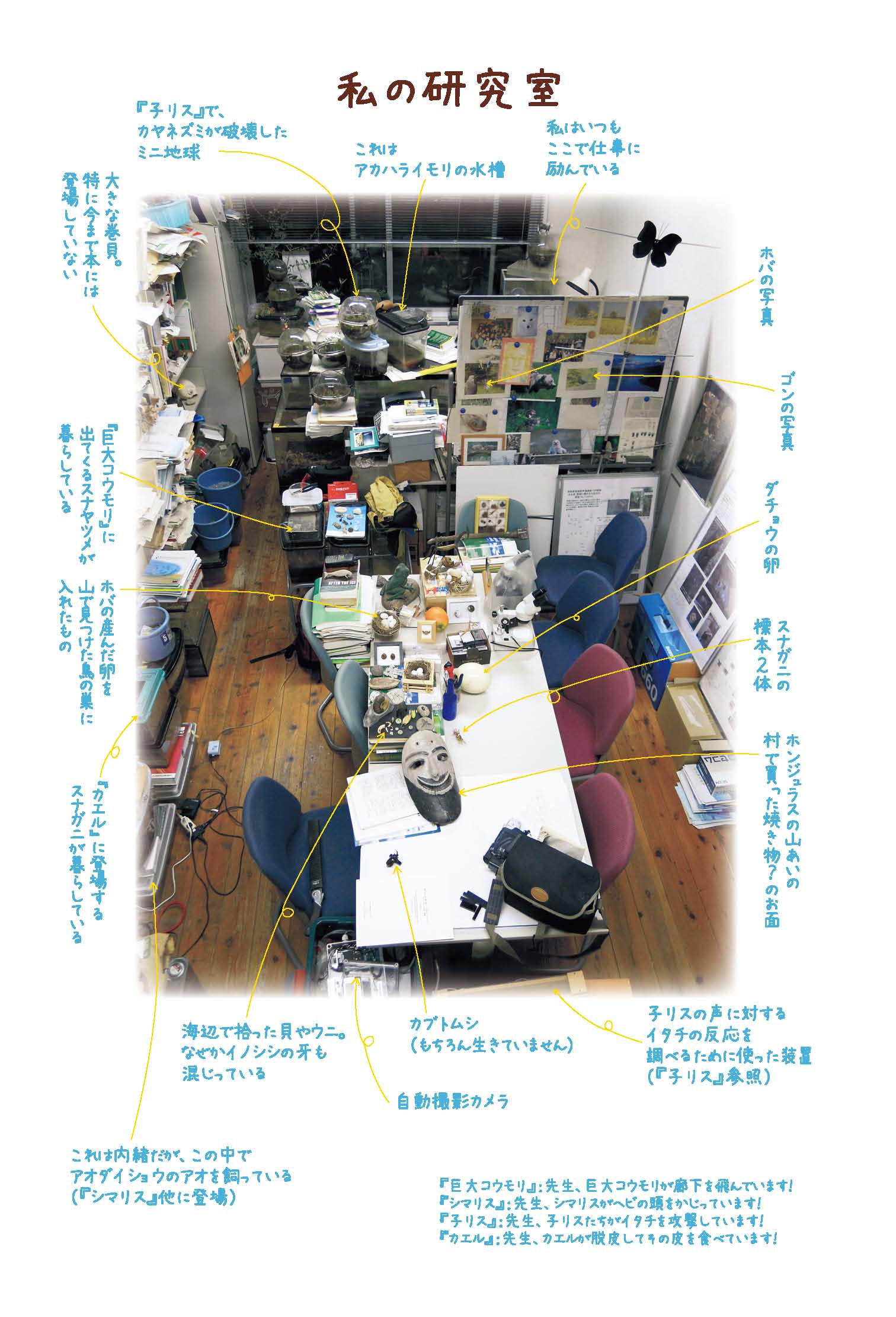 読者のみなさんのおかげで、『先生!』シリーズも第五弾となる。 このシリーズを書いてきて、よかった、うれしい、と思うことはいろいろある。 その一つは、読者の方からのメッセージである。手紙や葉書やネット上での本へのレビューなどで、「読んでよかった」「元気が出た」というメッセージを伝えられると、私は大変励まされる。 私が勤務する大学の学生が本についていろいろ言ってくれるのもうれしい。 最近は、私のゼミの学生は、本の“ネタ”の心配をしてくれたり、次の本のタイトルを考えてくれたりするようになった。 本文にも書いているが、大学を変わられた先生がゼミ室に残していった海産動物の水槽を、私のゼミで引き取ることになり、水槽の引っ越しをしたとき、ゼミの学生のYsくんは、「これも本のネタになりますね」と言った。(そのとおり、しっかりネタにさせてもらいました。) そのYsくんと、同じくゼミ室の主のYnくんは、別なとき、廊下で学生たちに“つかまっていた”コゲラ(キツツキの仲間)を救出して私のところに持って来てくれたりして……。私の本のネタを考えてくれてのことだったらしい。 YsくんとYnくん、そのときゼミ室にいたIsさん、そして私が見守るなか、コゲラはゼミ室の窓から元気に飛び立っていった。 一方、Iyくんは、ある出来事を私に教えてくれ、それにちなんだタイトルまで考えてくれた。題して「先生、スズメがスズメバチの巣に巣をつくっています!」だ。 ちなみに、そのスズメバチの巣は、私もよく知っていた。 五年ほど前、ヤギ小屋のそばの実験棟の軒下(地上一五〜二〇メートルくらいの高さがあった)につくられたコガタスズメバチの巣である。当時、事務の人が、誰かからその話を聞いたらしく、大学の全学生、全教職員に向けてメールを送った。 「……危険ですから近づかないようにしてください。近々、業者を頼んで除去します……」と。 その巣にずっと前から気づき、高いところを単に飛んでいるだけのハチにまったく危険など感じていなかった私とヤギ部の部員たちは、事務に、そこまでする必要はない、と申し入れた。 結局、その巣は残り、ハチたちも心おきなく子育てをし、数年後には、巣は空き家になっていた。 そうか、そこへスズメが巣をつくったか。 そりゃいい。 確かに、「先生、スズメがスズメバチの巣に巣をつくっています!」だ。 もちろん私は、Iyくんと、そのとき近くにいたIgさんと一緒に、現場を見に行った。 途中、Mさんも加わり、現場で、スズメバチの巣につくられたスズメの巣を、下から見上げ、スズメがどのように巣に入り、巣から出ていくのか眺めた。しばらくすると首が痛くなったので、野生の芝の上に、みんなで寝ころんで、スズメの様子を見ていた。 耳を澄ますと、スズメバチの巣のなかのスズメの巣のなかから、餌をねだる子スズメの鳴き声が聞こえてきた。 そして、見ていると、子スズメに餌を運ぶ大人のスズメは三羽いた。私は、「一羽はヘルパーの可能性があるなー」とみんなに話した。 ヘルパーというのは、つがい、つまり親鳥の二羽を助けて、ヒナへの餌運びなどを手伝う個体のことである。ヘルパーがよく知られている種では、ヘルパーは、その両親の子ども、つまり、そのとき両親が餌を運んでいるヒナの兄か姉である場合が多い。 私は、「これは、講義の導入で使えるなー」と感じて、写真を撮ることにした。 そのころ、生態学入門という講義で、毎回、導入の部分に“この一週間に撮った写真”というコーナーを設けていた。なかなか評判のよいコーナーで、学生が、「先生の写真は、単なる生物の写真ではなく、必ずその生物の生態を感じさせる写真ですばらしいと思います」といったような思いやりのある感想を書いてくれ、私も調子にのって、毎回、よい写真が撮れるように頑張っていた。 「スズメバチの巣のなかに巣をつくった、ヘルパーらしき個体もいるスズメたち」というのは、まさに“この一週間に撮った写真”にピッタリだ、と思ったわけである。 ところで、スズメバチの巣のなかのスズメの巣の下で、いろいろ位置を変えてカメラを構えていた私は、また面白いことに気がついた。 なんと、スズメたちも、スズメバチの巣のなかのスズメの巣の下でうろうろしている私を、注意深く観察していたのである。巣を支えている鉄骨の陰から体を乗り出して、首をのばして、懸命に私の様子をのぞいているのである。これも実に興味深いスズメの生態を示している。 よしっ、写真一枚。 このように、読者の方や、学生諸君に励まされながら、私は第五弾を書いた。 第五弾についても忌憚のないメッセージを(できれば、忌憚のないなかにも思いやりのあるメッセージを)いただければうれしい。そしてなによりも、読者のみなさんが、動物たちへの思いやりといくばくかの元気を感じていただければとてもうれしい。 最後になったが、築地書館の橋本ひとみさんは、毎回、私