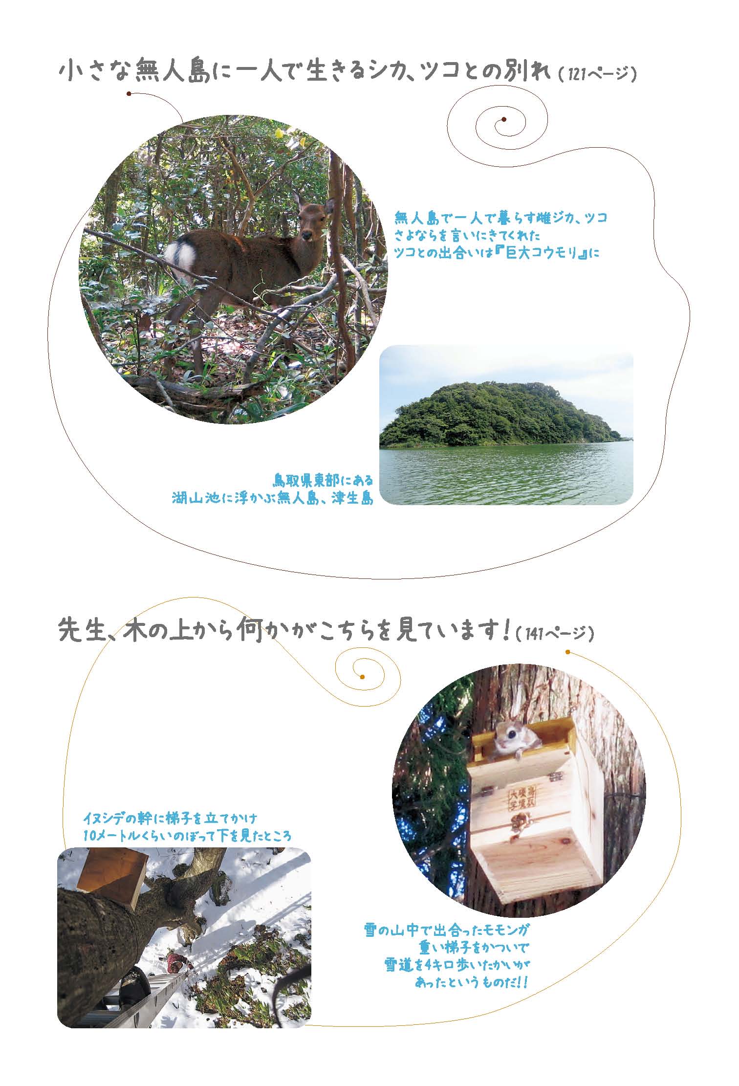 はじめに 子どものイソギンチャクはカタツムリのように這って動くのだ! ゼミ室に海産動物の水槽がやって来た話 フェレット失踪事件 地下室から忽然と消えたミルク テニスコートで死にそうになっていたクサガメ クサガメとイシガメの違いは実に面白い ヤモリの恩返し? 私の講義「保全生態学」についての学生のコメントとヤモリの話 ヒメネズミの子どもはヘビやイタチの糞に枯れ葉をかぶせようとする 新しいタイプの対捕食者行動の発見! 小さな無人島に一人で生きるシカ、ツコとの別れ 最後のアイサツに来てくれたのかもしれない 先生、木の上から何かがこちらを見ています! 雪の山中で起きた驚きの出来事 ヤギのことが気になってしかたないキジの話 鳥取環境大学は里山のなかの大学?